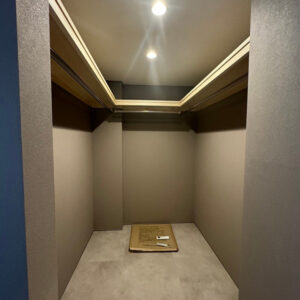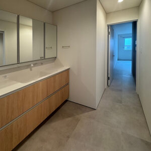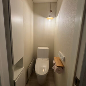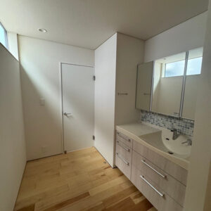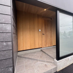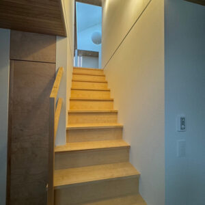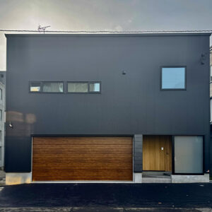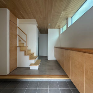 T様邸は、1階にお風呂、洗濯スペース、ウォークインクローゼット付きの洋室を設置。2階にはLDKのほかに洋室がふたつ。トイレと洗面所は両方に設置したいとのご希望でした。隣のアパートとの距離が近いため、玄関ホールには高い位置に曇りガラスの窓を細長く設置して、十分な光を取り入れています。外壁はガルバリウム鋼板。玄関ポーチには木をあしらい、木製断熱ドアで柔らかさを出しました。