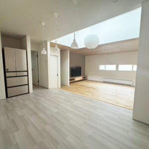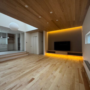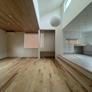 施主様のご要望のひとつに「車を二台駐められること」があったので、物も置ける駐車スペースが1階の大部分を占めることになりました。必然的にLDKは2階に設置することになりますが、普通の窓のほかに天窓(トップライト)からも光を取り入れることができるので明るいリビングになり、周囲の家や通行人の視線も気になりづらいです。